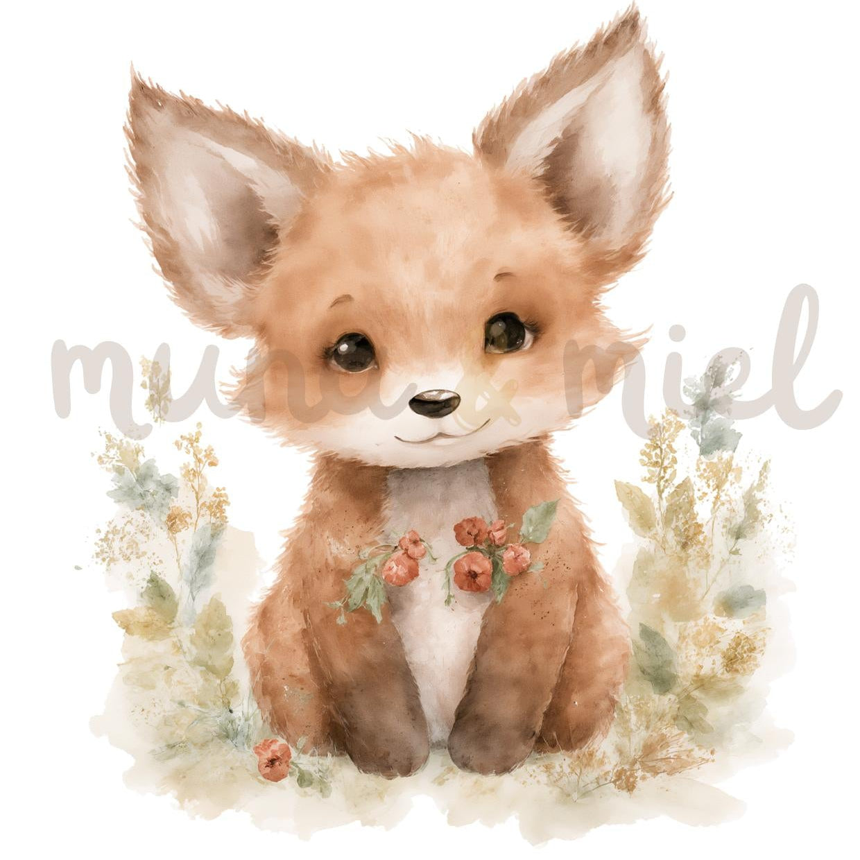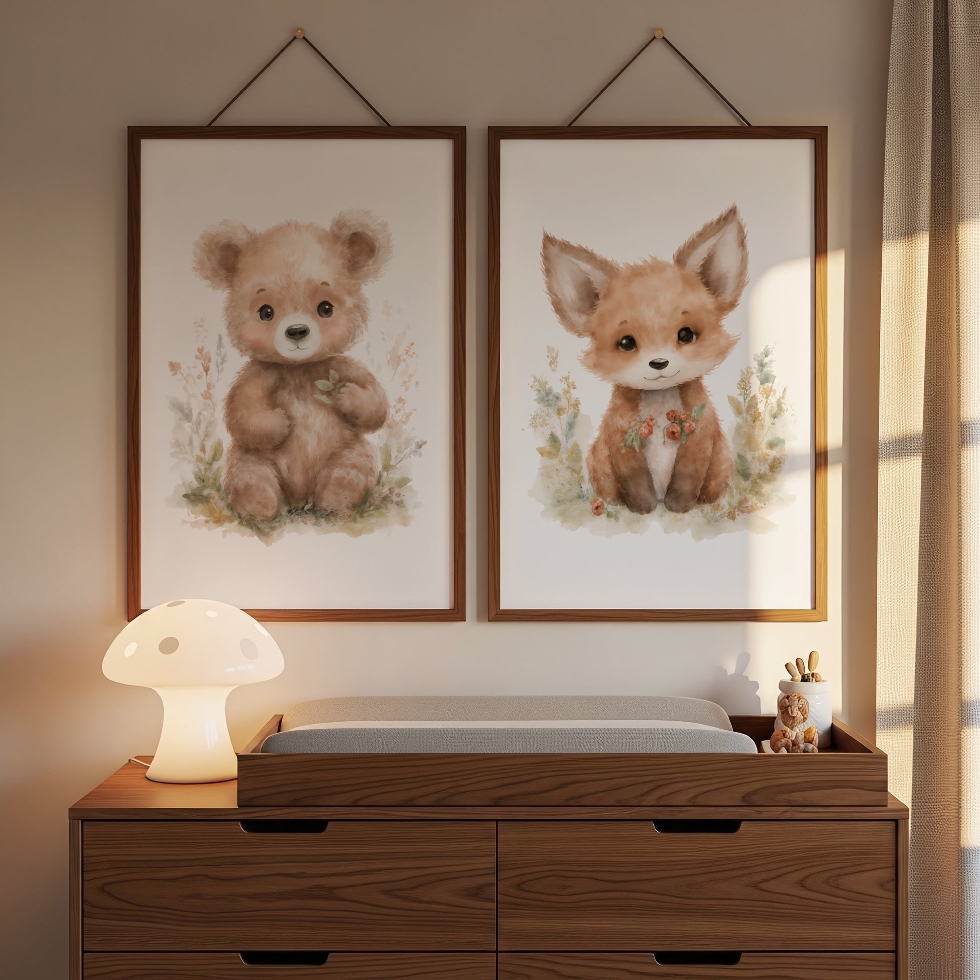 Decorá el cuarto de tu bebé con este dúo de láminas imprimibles en acuarela, protagonizado por los más dulces animalitos del bosque. Su estilo suave y natural crea un ambiente cálido, ideal para acompañar los primeros sueños y juegos.
