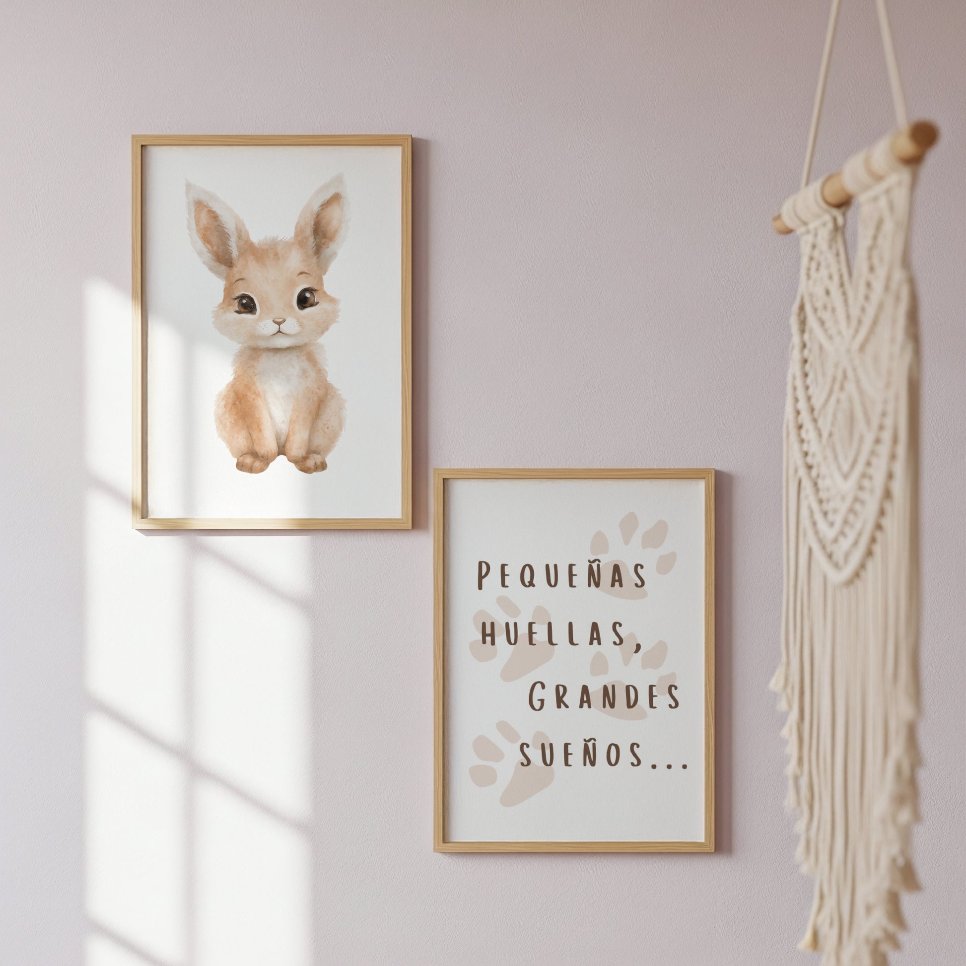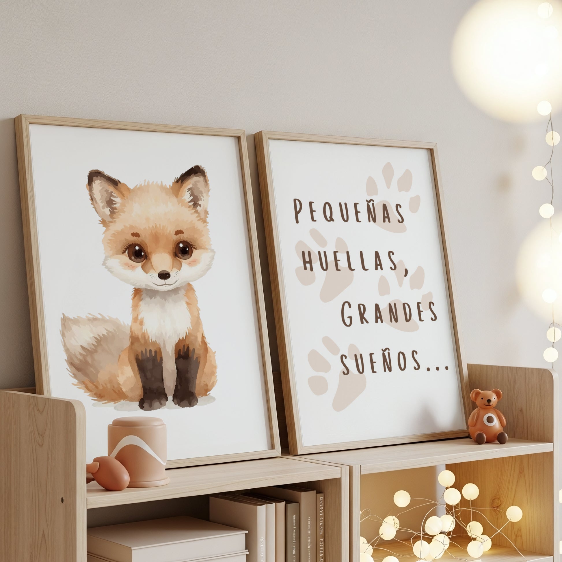 Una ilustración de animalito del bosque acompañado por frase inspiradora ¨Pequeñas Huellas, Grandes Sueños¨. Podes elegir el animalito que querés en el dúo al momento de la compra. Perfectas para decorar habitaciones infantiles o regalar en nacimientos, bautismo y baby showers.