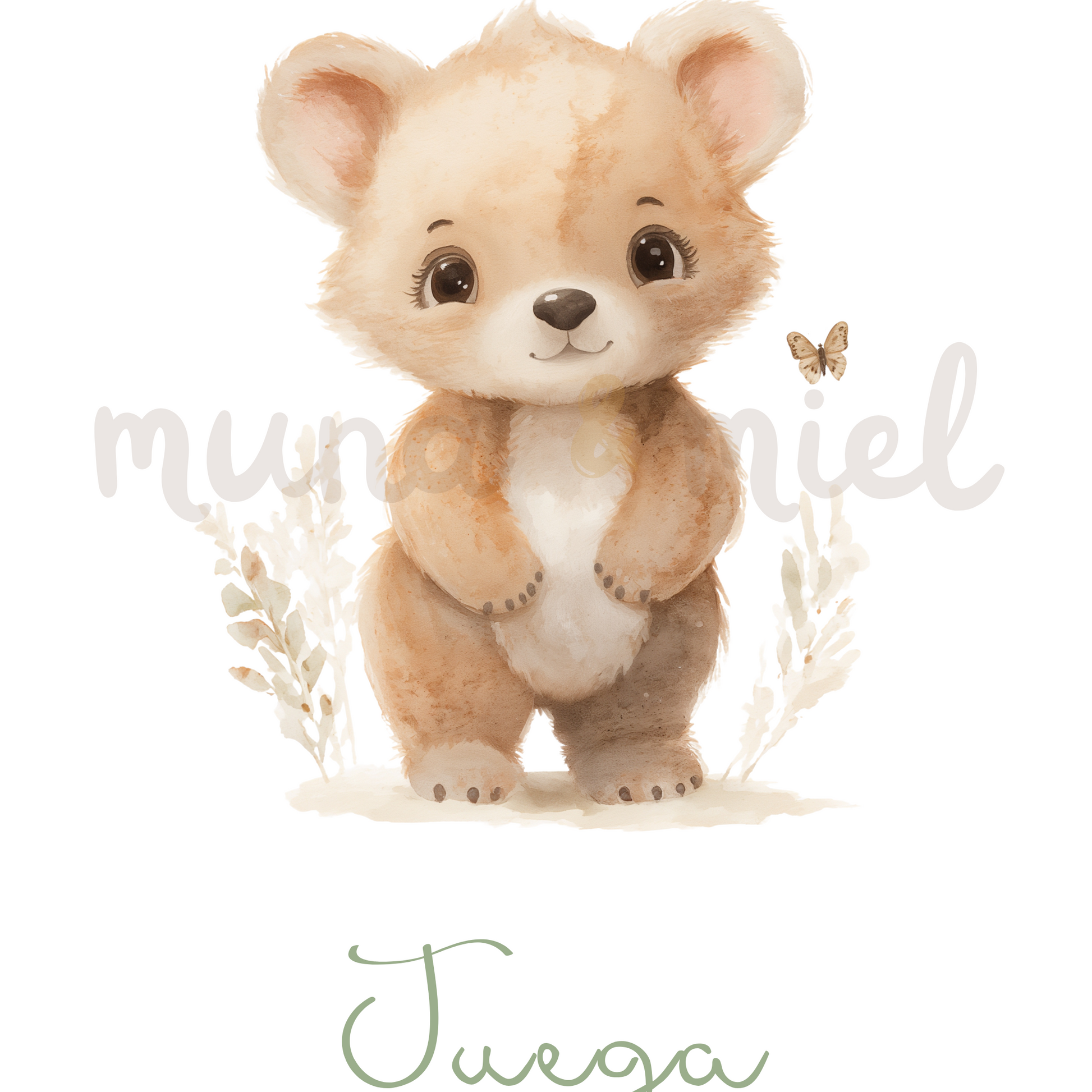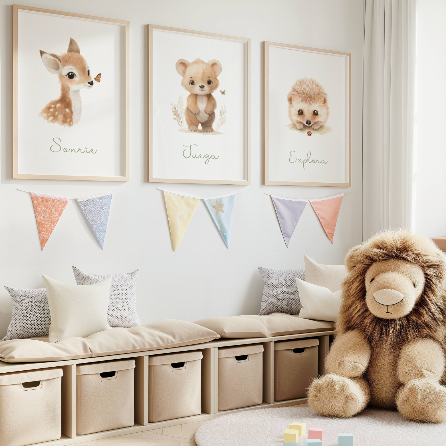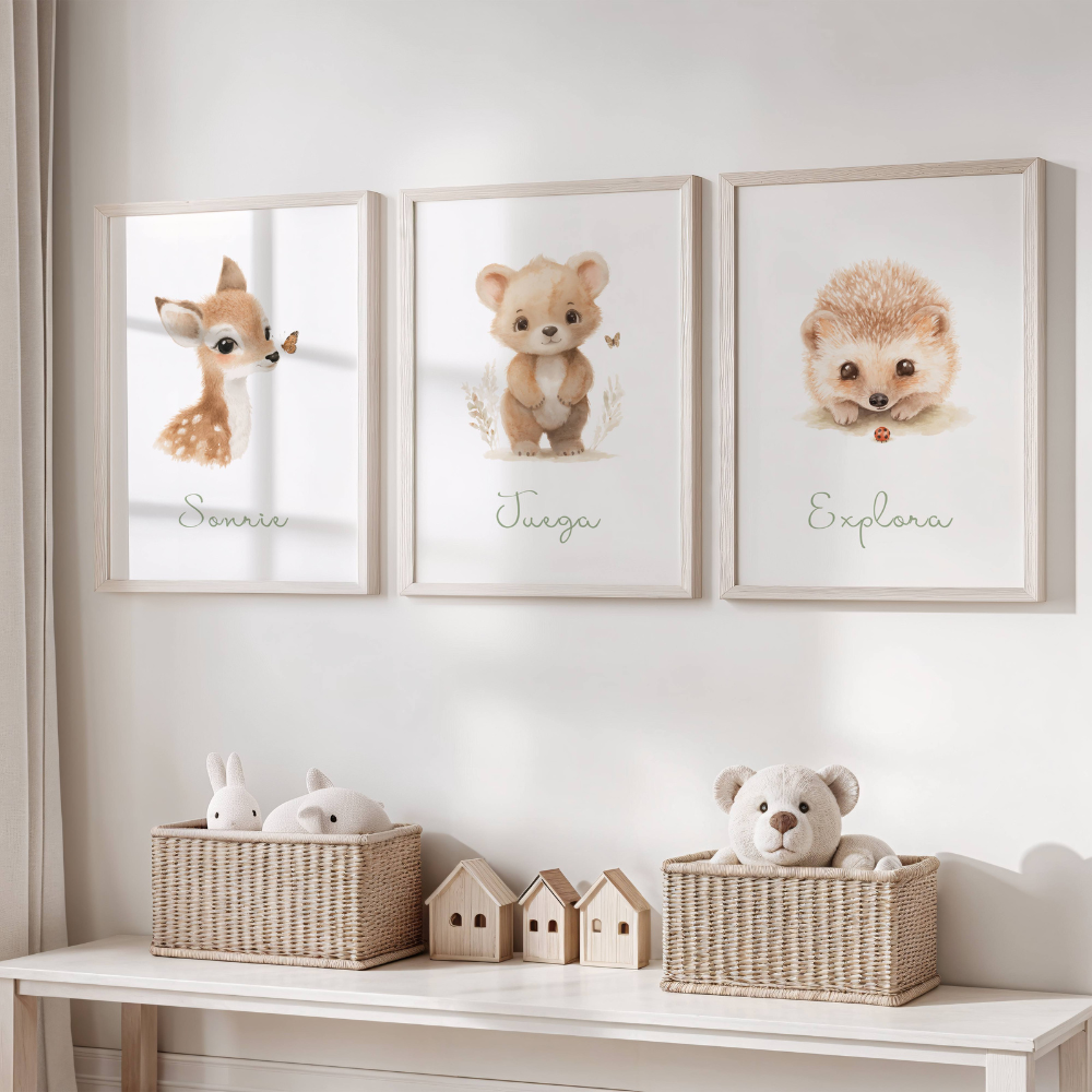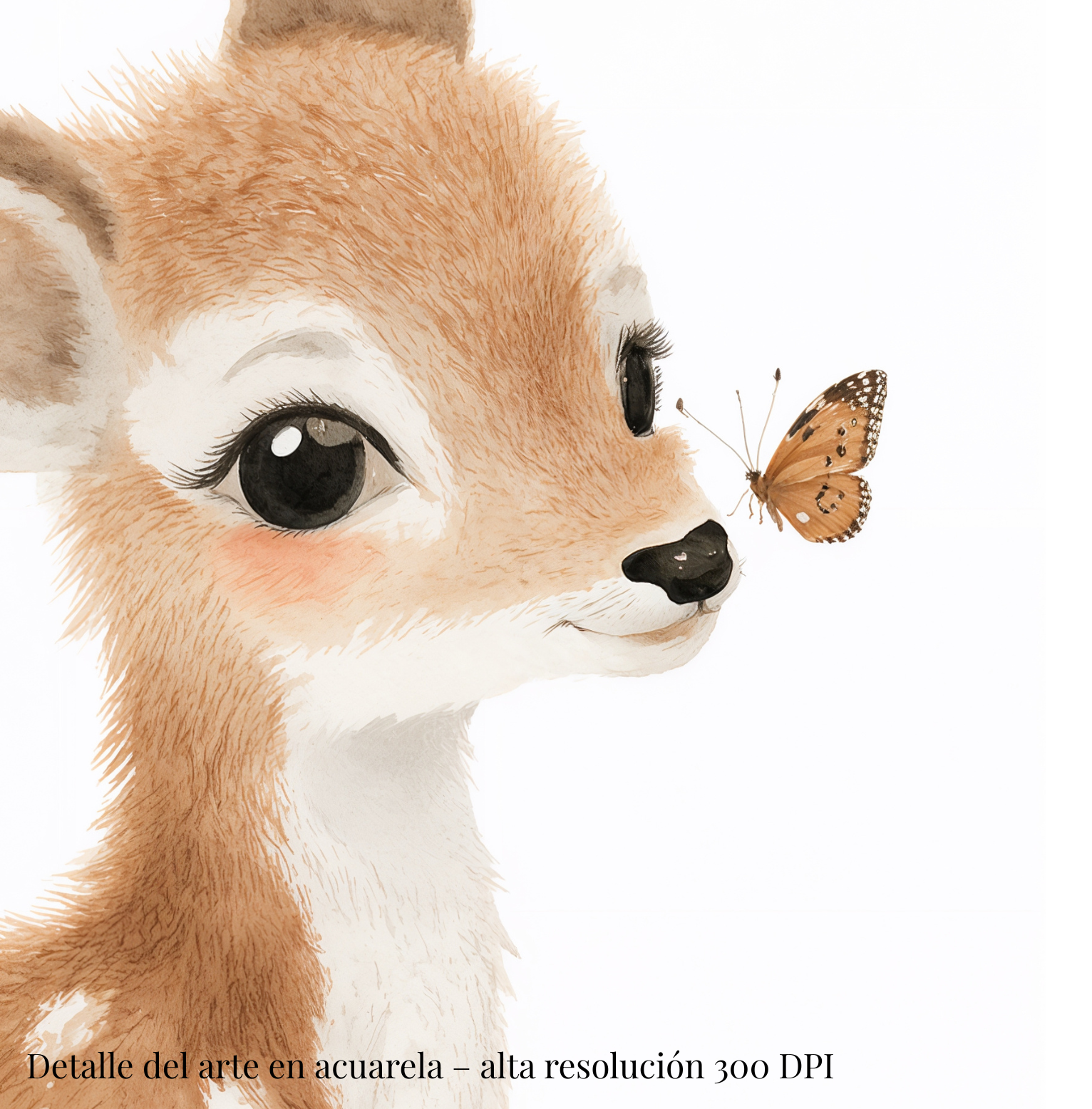 Dale un toque dulce y natural al cuarto de tu bebé con esta ilustración en acuarela, inspirada en los animales del bosque.
